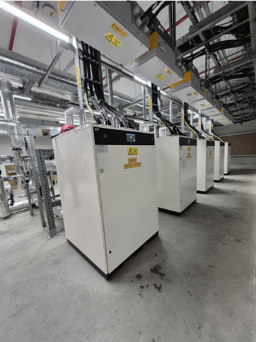 Dans certaines configurations, notamment pour les bâtiments tertiaires, industriels ou les réseaux de chaleur, les chaudières électriques interviennent en complément de la géothermie.